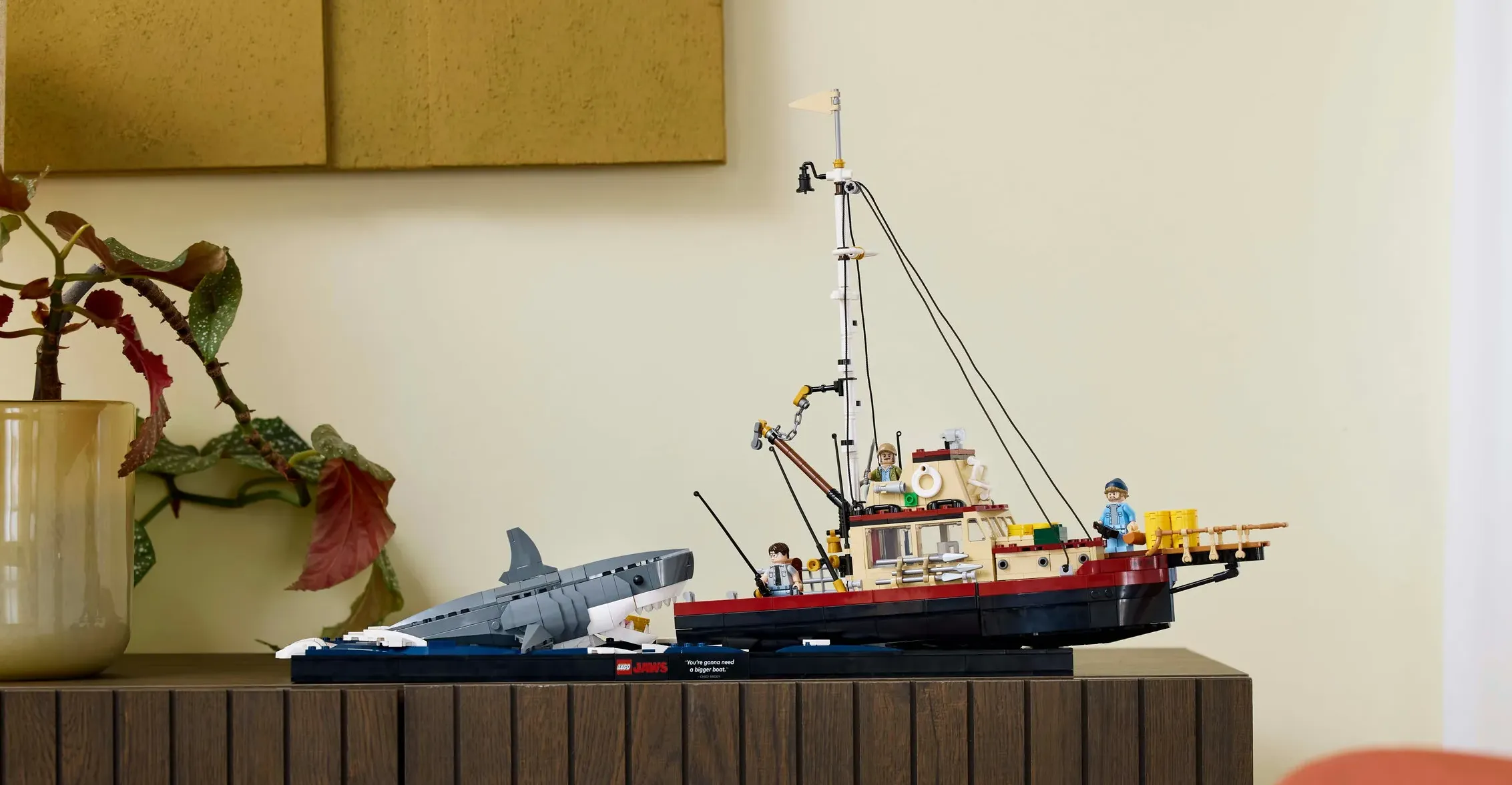 The LEGO Ideas Jaws diorama kit for adults is a must-have for Jaws fans, classic-film enthusiasts, and collectors of film memorabilia. The set not only includes the detailed Orca boat model but also a brick-built seawater base depicting the Jaws shark attacking the boat. Additionally, a printed tile with Chief Brody’s famous line, “You’re gonna need a bigger boat,” adds a nostalgic touch to this playful centerpiece. The set also offers an alternative display stand for the fully built Jaws shark figure and minifigures.