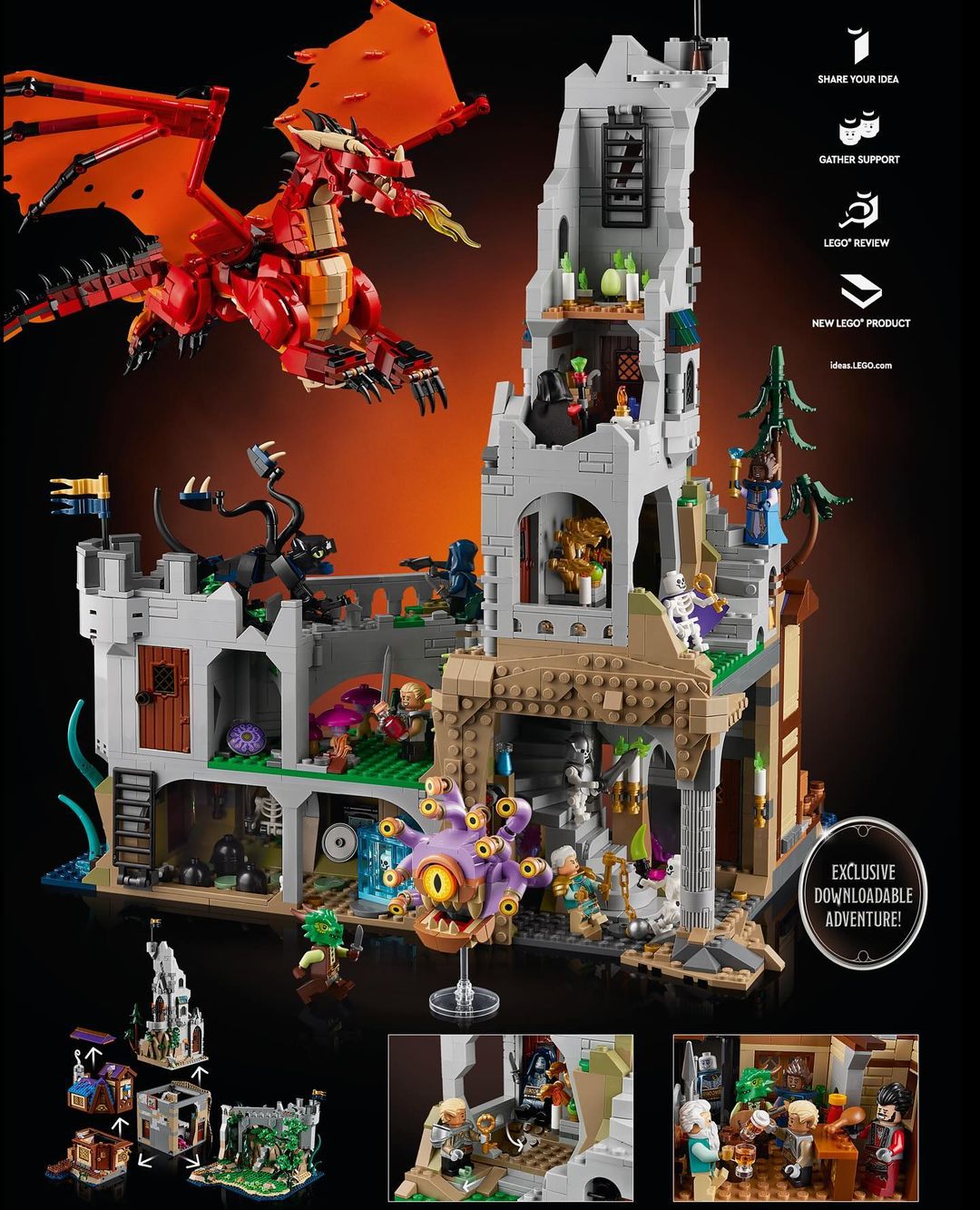 Now, let's turn our attention to the present moment as we unveil the LEGO Ideas DUNGEONS & DRAGONS: Red Dragon’s Tale Set (21348) - a stunning tribute to the enduring legacy of Dungeons & Dragons. Crafted with meticulous attention to detail, this 3,745-piece set transports builders into a world of epic adventures and mythical creatures.