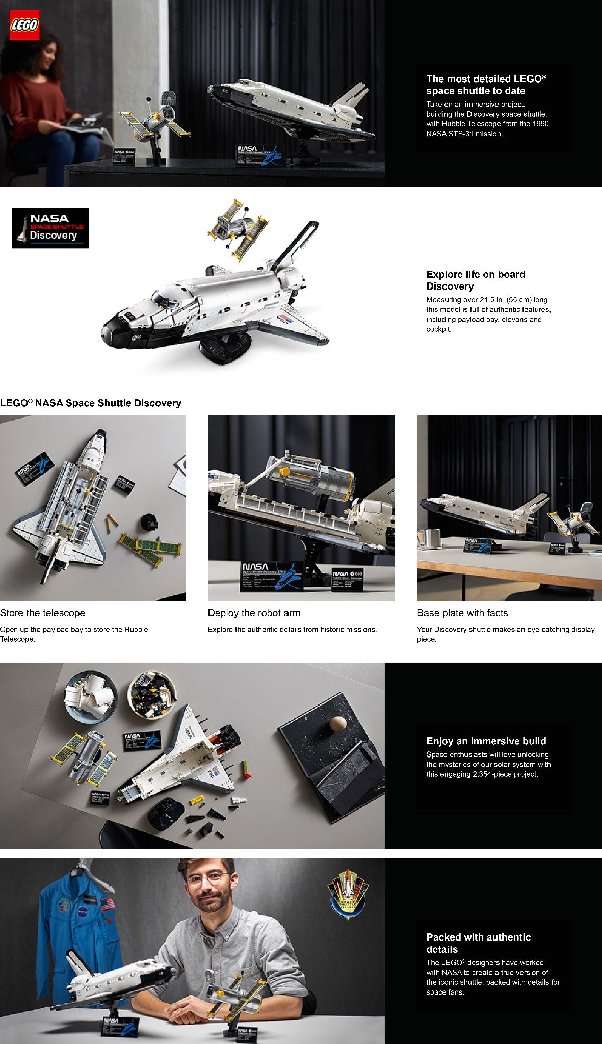 Celebrate the wonders of space with this LEGO® NASA Space Shuttle Discovery (10283) model building set for adults. With 2,354 pieces, this engaging challenge lets you build the Space Shuttle Discovery, plus the Hubble Space Telescope, launched on NASA’s STS-31 mission in 1990.