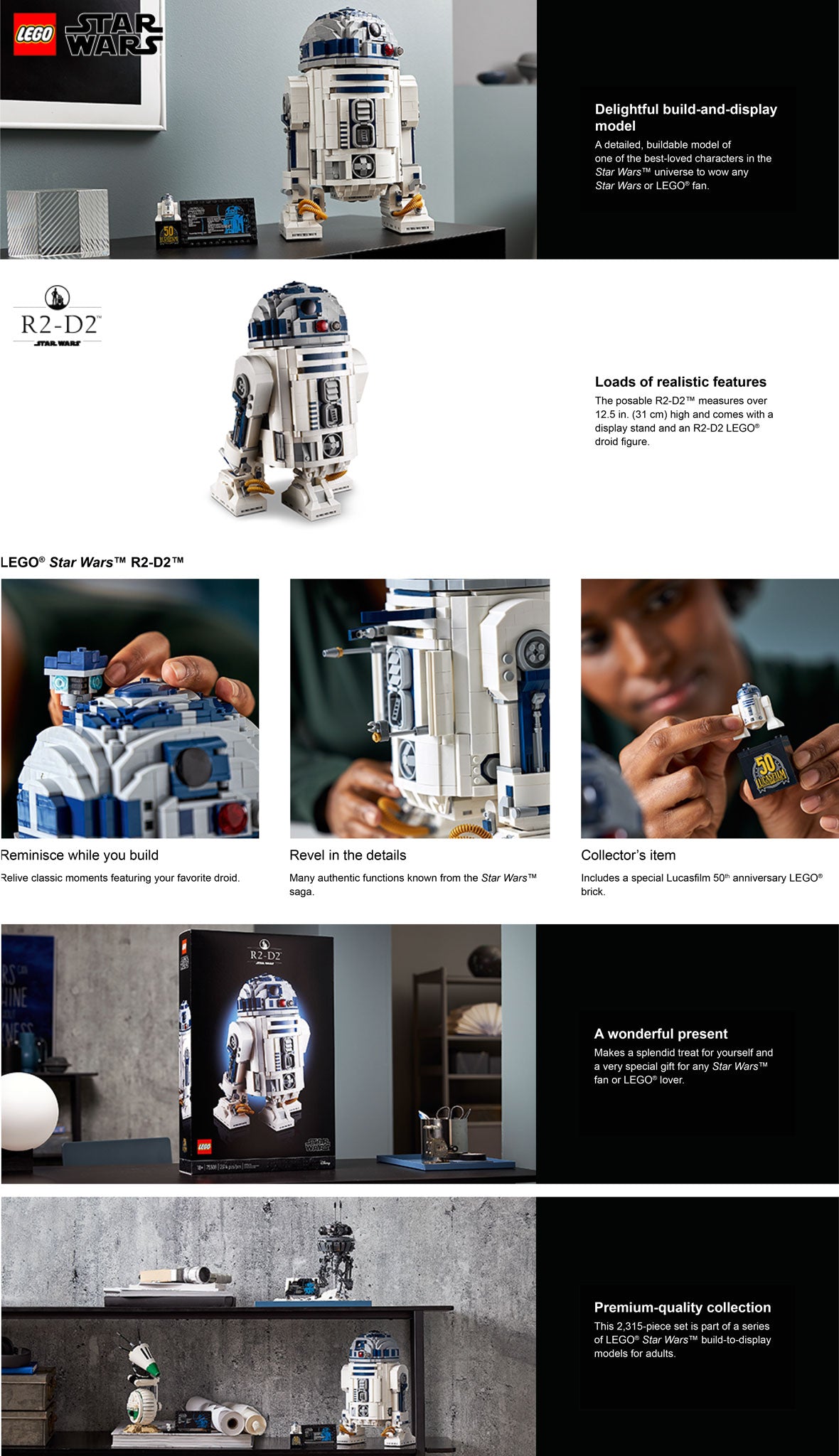 This cool construction model comes with a buildable display stand, featuring an information plaque, R2-D2 LEGO droid figure and an exclusive Lucasfilm 50th anniversary LEGO brick, to complete an awesome centerpiece for your home or workplace.